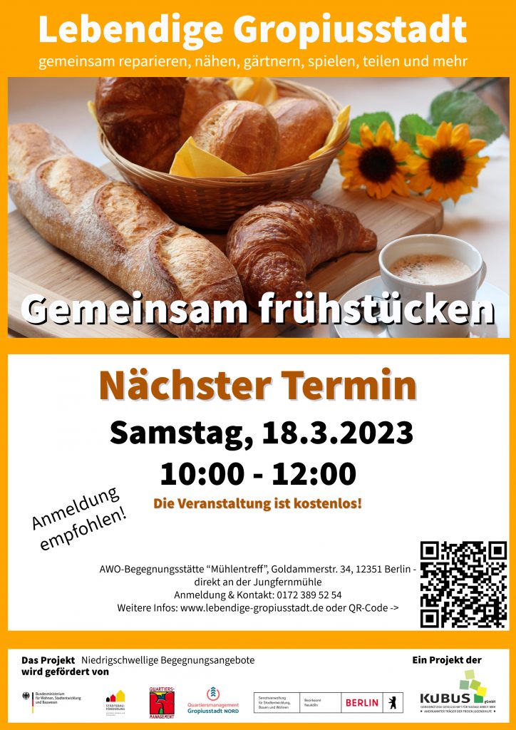 Wir organisieren einmal im Monat ein kleines, gemütliches und kostenloses Frühstück. Sie brauchen nichts mitzubringen als gute Laune und Hunger. Genießen Sie zwei Stunden mit netten Menschen. Kommen Sie ins Gespräch oder hören Sie einfach nur zu und genießen Sie Ihr Frühstück.