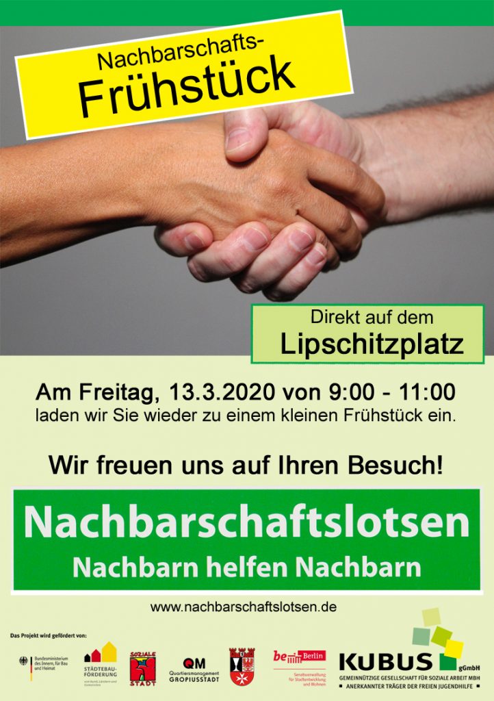 Am Freitag, 13.3. ab 9:00 gibt es wieder ein gratis Nachbarschaftsfrühstück mit den Nachbarschaftslotsen auf dem Lipschitzplatz.