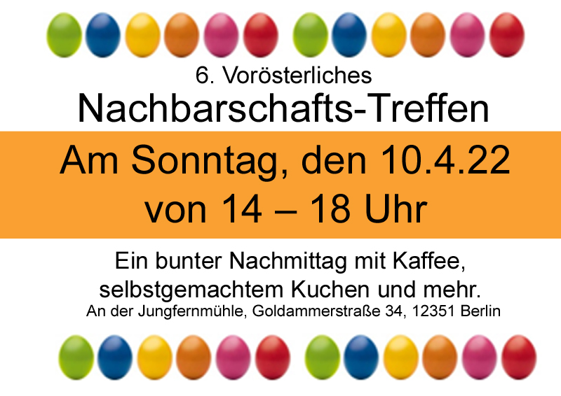 Vorösterliches Nachbarschaftstreffen Veröffentlicht 17. März 2022 Mathias Kalender Wann: 10. April 2022 um 14:00 – 18:00 2022-04-10T14:00:00+02:00 2022-04-10T18:00:00+02:00 Wo: Platz an der Jungfernmühle
