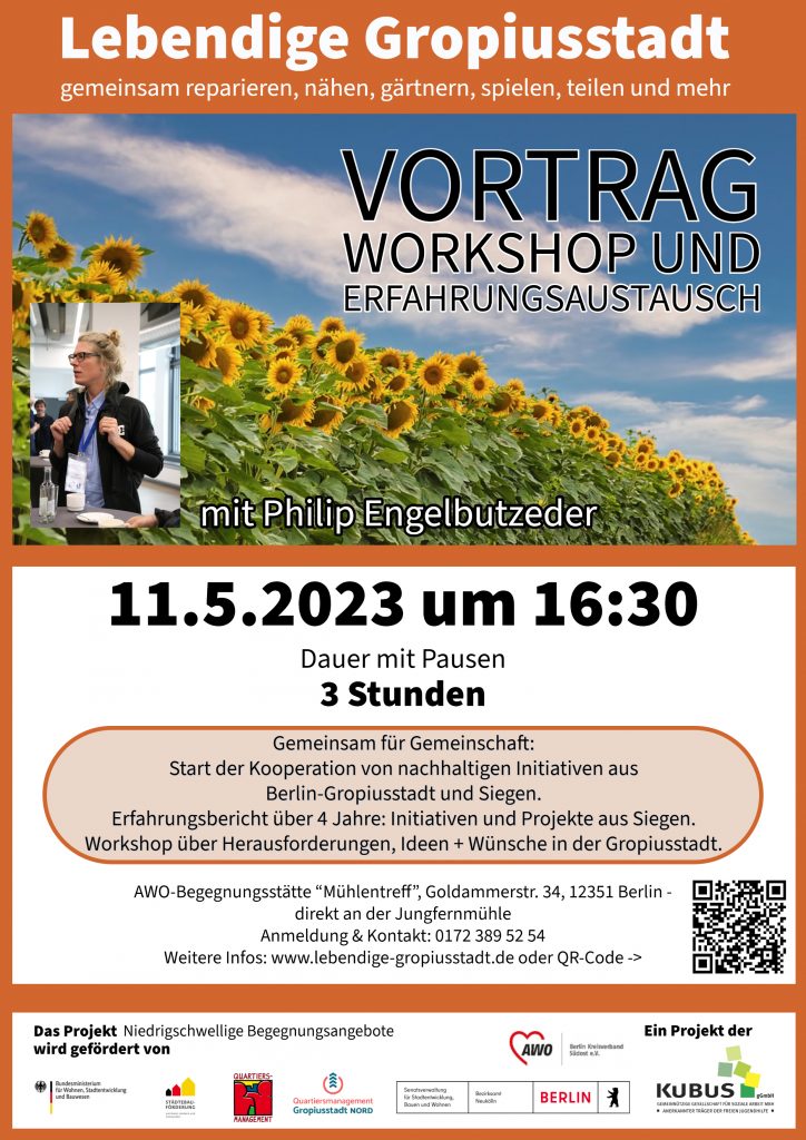 Vortrag und Workshop: „Gemeinsam für Gemeinschaft“ Veröffentlicht 25. April 202325. April 2023 Mathias Kalender Wann: 11. Mai 2023 um 16:30 – 19:30 2023-05-11T16:30:00+02:00 2023-05-11T19:30:00+02:00 Wo: AWO-Mühlentreff Goldammerstraße 34 Workshop