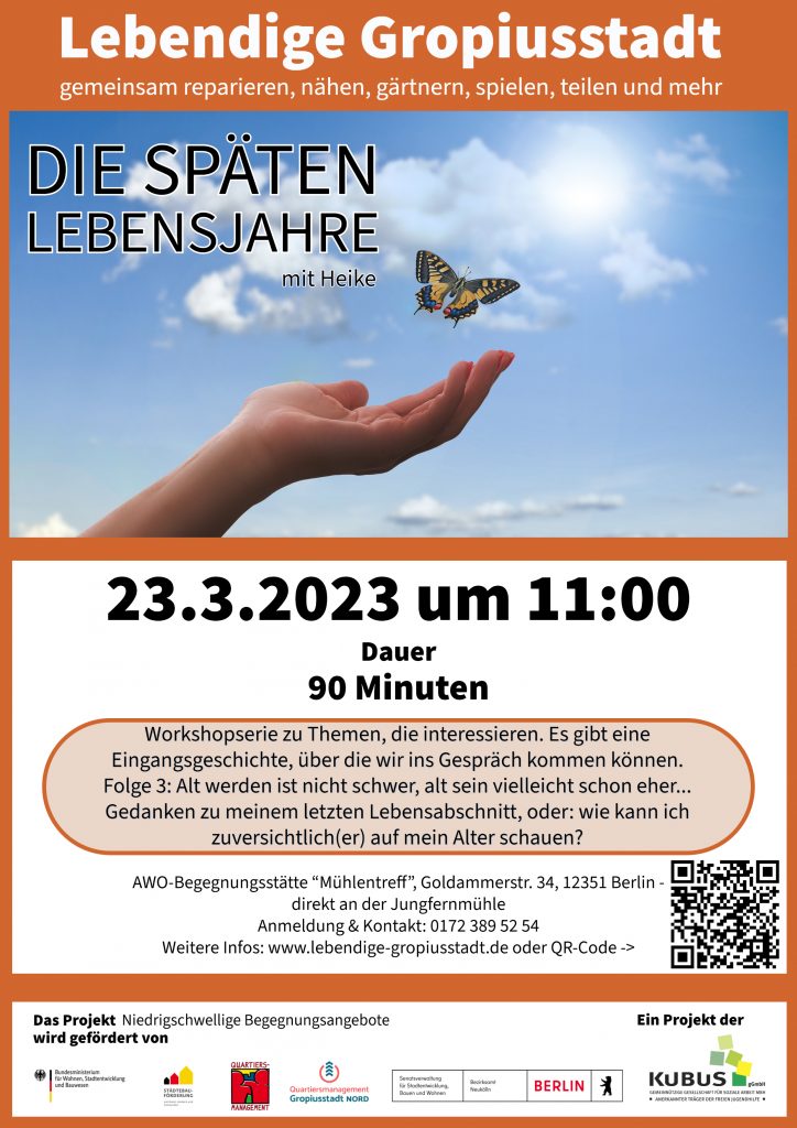 Workshopserie zu Themen, die interessieren. Es gibt eine Eingangsgeschichte, über die wir ins Gespräch kommen können. Folge 3: Alt werden ist nicht schwer, alt sein vielleicht schon eher. Gedanken zu meinem letzten Lebensabschnitt, oder: Wie kann ich zuversichtlich(er auf mein Alter schauen?