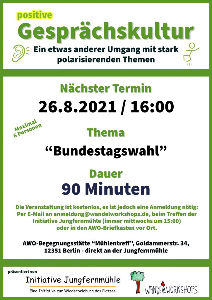 Positive Gesprächskultur – Ein etwas anderer Umgang mit stark polarisierenden Themen. Jetzt monatlich in der AWO Begegnungsstätte „Mühlentreff“.